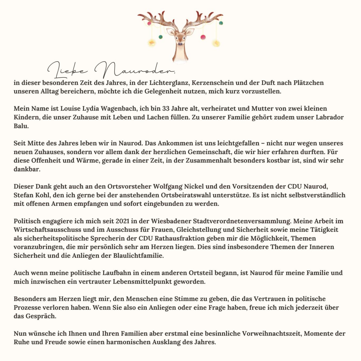Auch wenn ich inzwischen nicht mehr in Biebrich wohne, ist dieser Stadtteil nach wie vor ein wichtiger Teil meines Lebens. Die Menschen und ihre Anliegen liegen mir sehr am Herzen, und ich setze mich weiterhin mit voller Energie für die Bürgerinnen und Bürger in Biebrich ein. Es ist mir ein Anliegen, ansprechbar zu bleiben und weiterhin den persönlichen Dialog zu suchen – nicht nur in Biebrich, sondern nun auch in Naurod.